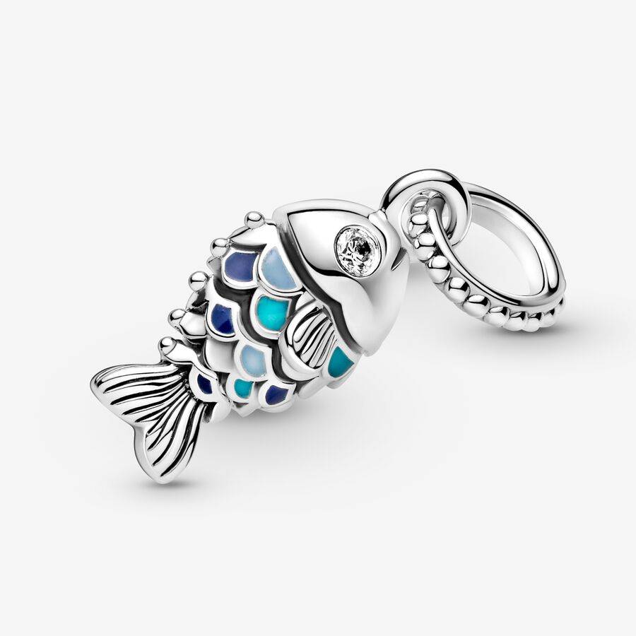 Add an enchanting underwater friend to your collection with the Blue Scaled Fish Dangle Charm. This sterling silver fish charm captures the essence of the sea with shimmering clear cubic zirconia eyes, hand-applied blue enamel scales in three tones, grooved lines on the tail and fins and delicate beading along the spine. A reminder to go with the flow, the fish appears to be swimming as you move thanks to a flexible design and subtle moving parts.