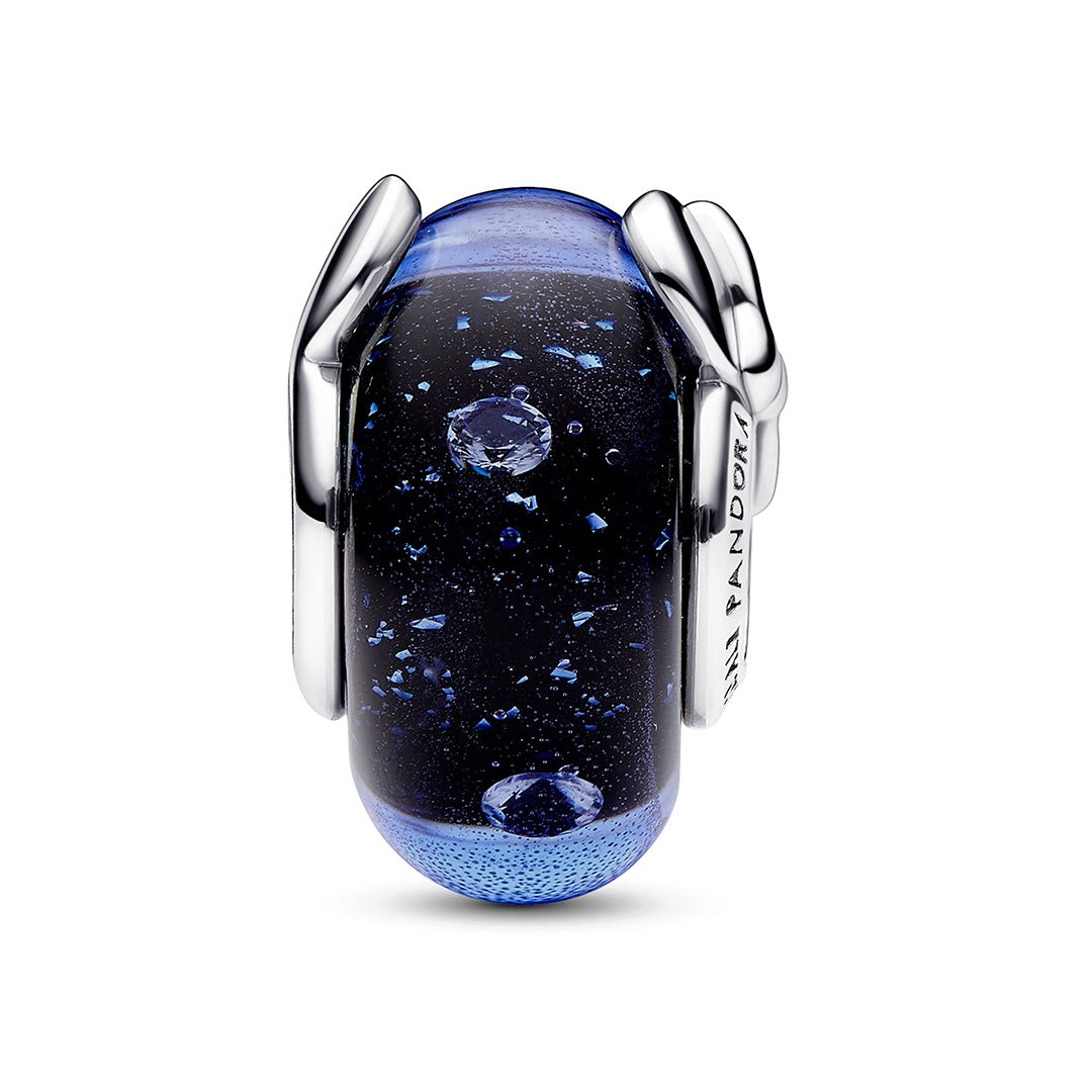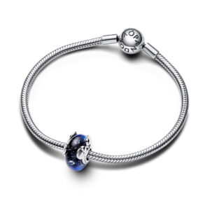 Wear your favorites with the Disney Mickey Mouse & Minnie Mouse Blue Murano Glass Charm. Disney’s most beloved duo make a return in the newDisney x Pandora collection This special charm features a shimmering effect inspired by Disney’s much-loved Fantasia. The charm features a sterling silver core surrounded by glittery two-tone blue Murano glass with four round clear cubic zirconia suspended inside it. Wear Mickey Mouse and Minnie Mouse every day on your favorite chain or bracelet.