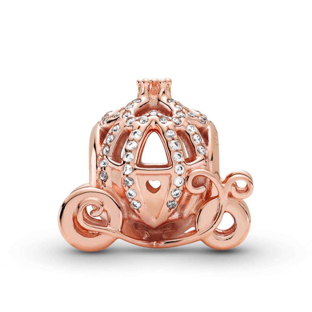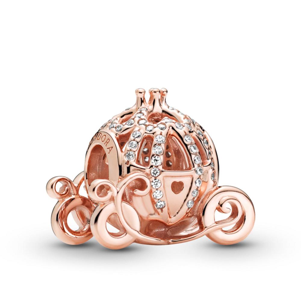 Show up to the ball in style with the Disney Cinderella Sparkling Carriage Charm. Designed to celebrate the 70th anniversary of Disney’s Cinderella, this piece is hand-finished in 14k rose gold-plated unique metal blend. Shaped like her pumpkin carriage, this openwork charm is decorated with clear stones and features a 3D crown on its roof and ornamental wheels. Style this charm on your Pandora Moments bracelet with shimmering pieces in sterling silver for a magical mixed metal look.