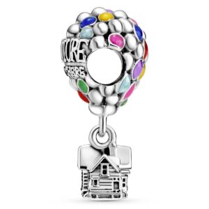 Get ready to go on a journey of a lifetime with Disney’s Up House & Balloons Charm. The colorful charm features a bundle of hand-applied enamel princess blue, light blue, mandarin orange, pale cerise, vibrant green, purple and magenta balloons carrying the sterling silver dangle house that Carl uses to go on his fantastic journey. Raised letters amongst the many colorful balloons add an inspirational touch with the statement “Adventure is out there”.