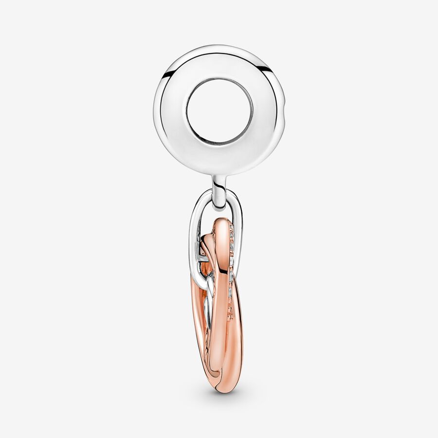 A powerful symbol of unbreakable love, the Family Always Encircled Dangle Charm features two entwined 14k rose gold-plated circles, one of which is decorated with clear cubic zirconia pavé. A sterling silver disc dangling from the bail is engraved with the words “ALWAYS TOGETHER.” The harmony of shapes and metal tones in this charm symbolizes how we come together as a family despite our differences.