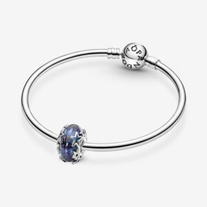 This striking Galaxy Blue & Star Murano Charm reflects the beauty of the night skies. Hand-finished in sterling silver, the galaxy-inspired charm features glittery blue Murano glass surrounded by asymmetric cut-out silver stars of different sizes. Wear this charm to stay connected to the power of the stars and planets of the galaxy no matter where in the world you are, or gift this charm to someone special to show you care.