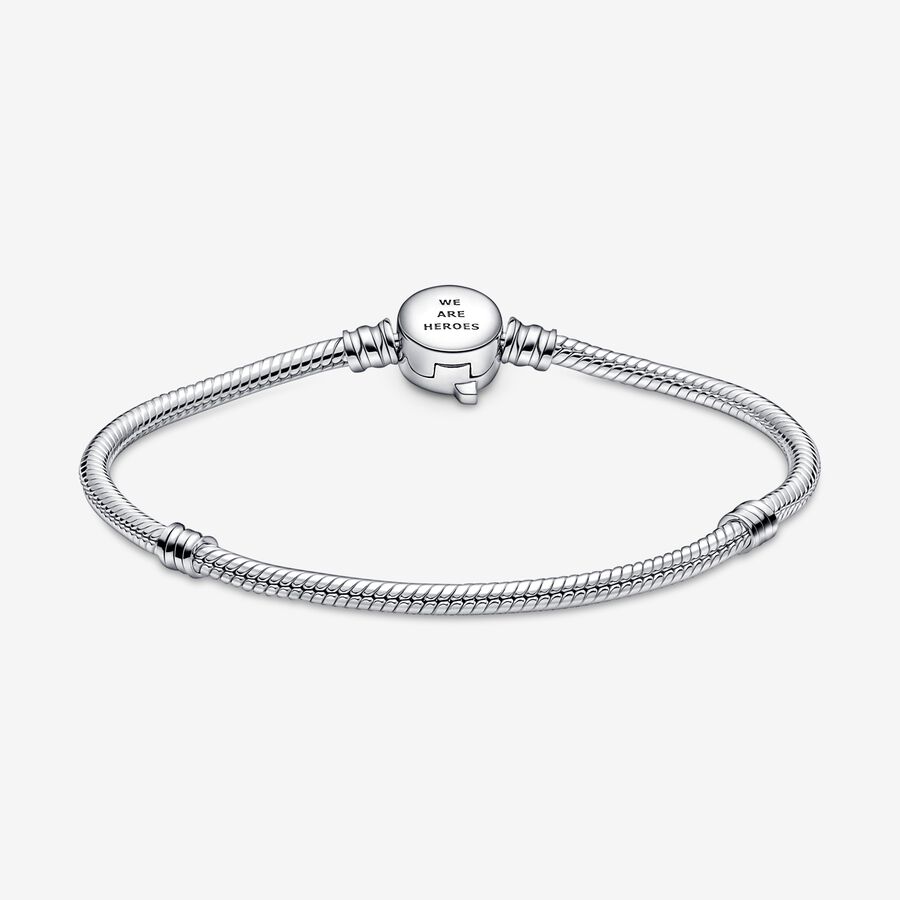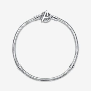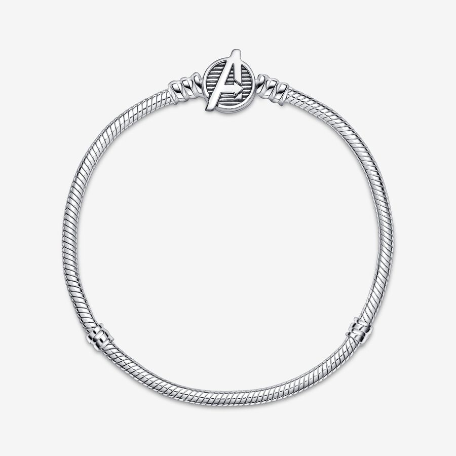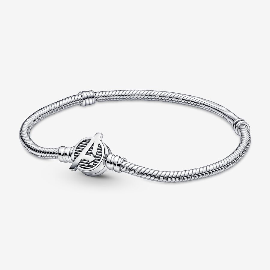 Assemble your heroes on our Pandora Moments Marvel The Avengers Logo Clasp Snake Chain Bracelet. Hand-finished in sterling silver, this charm holder features a clasp engraved with the iconic Avengers logo and etched line details. It’s the perfect way to showcase your favorite characters and tell the world about your love for the Marvel Cinematic Universe. Style it with up to 18 charms.