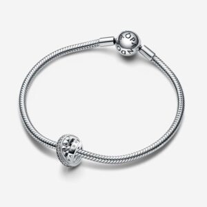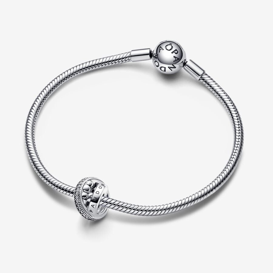 A sophisticated addition to your jewelry box. Crafted in sterling silver, the Pandora Moments Logo Pavé & Beads Charm features two circular bands enveloped within a diagonal band to create a unique geometrical shape. A row of pavé adds sparkle, while microbeading gives it texture and dimension. Wear this charm on your bracelet and tell your story, your way.