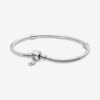 Start your x Pandora collection with this sterling silver charm bracelet. The classic snake chain style is detailed with a clasp, shaped with her signature bow that’s been accented with clear cubic zirconia for a glittering finish. Add your edit of meaningful charms, or wear it solo or as part of a personal bracelet stack.