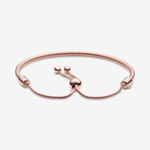 This stunning Pandora Moments Snake Chain Slider Bracelet is a sophisticated spin on the classic friendship bracelet. Hand-finished and 14k rose gold-plated – it features interchangeable end caps set with shimmering stones and an innovative sliding clasp that makes it easy to adjust. The perfect present for friends and loved ones, it can be worn as it is or filled with your favourite Pandora charms. The lobster clasp and jump ring are made from sterling silver plated with 14k rose gold.
