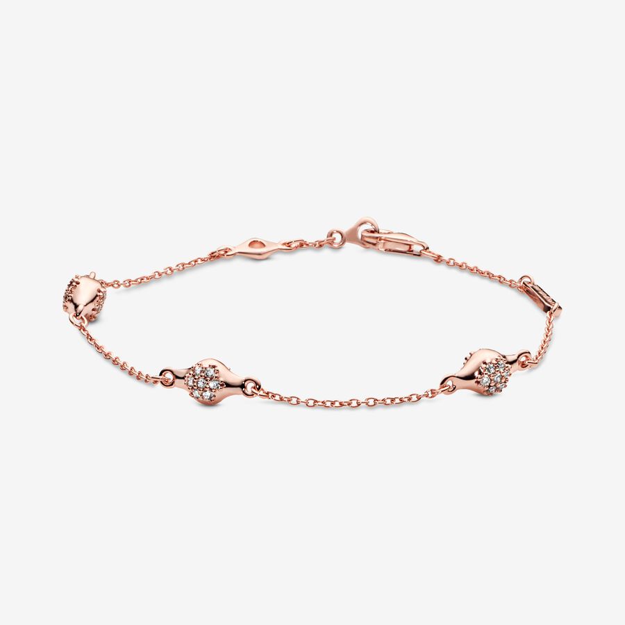 A modern rendition of our classic LovePods jewelry, this Pandora Rose™ chain bracelet is accented with flower bud-inspired adornments covered in cubic zirconia stones. The 14k rose gold-plated unique metal blend glows with a blush-pink hue. Wear it solo or layer with similar pieces from our collection to create a look that’s naturally you.