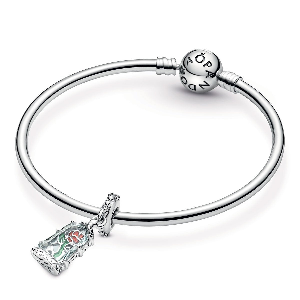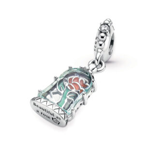 Add a magical touch to your style with the Disney Beauty and the Beast Enchanted Rose Dangle Charm. It features a transparent light blue Murano glass dome with engraved stars encasing a cut-out rose with red and green hand-applied enamel details. Hand-finished in sterling silver, the charm is decorated with clear cubic zirconia stones and micro-beads on the bail and features the engraving “Beautiful as a Rose” on the bottom. A spellbinding reminder of the power of love.