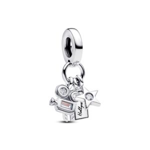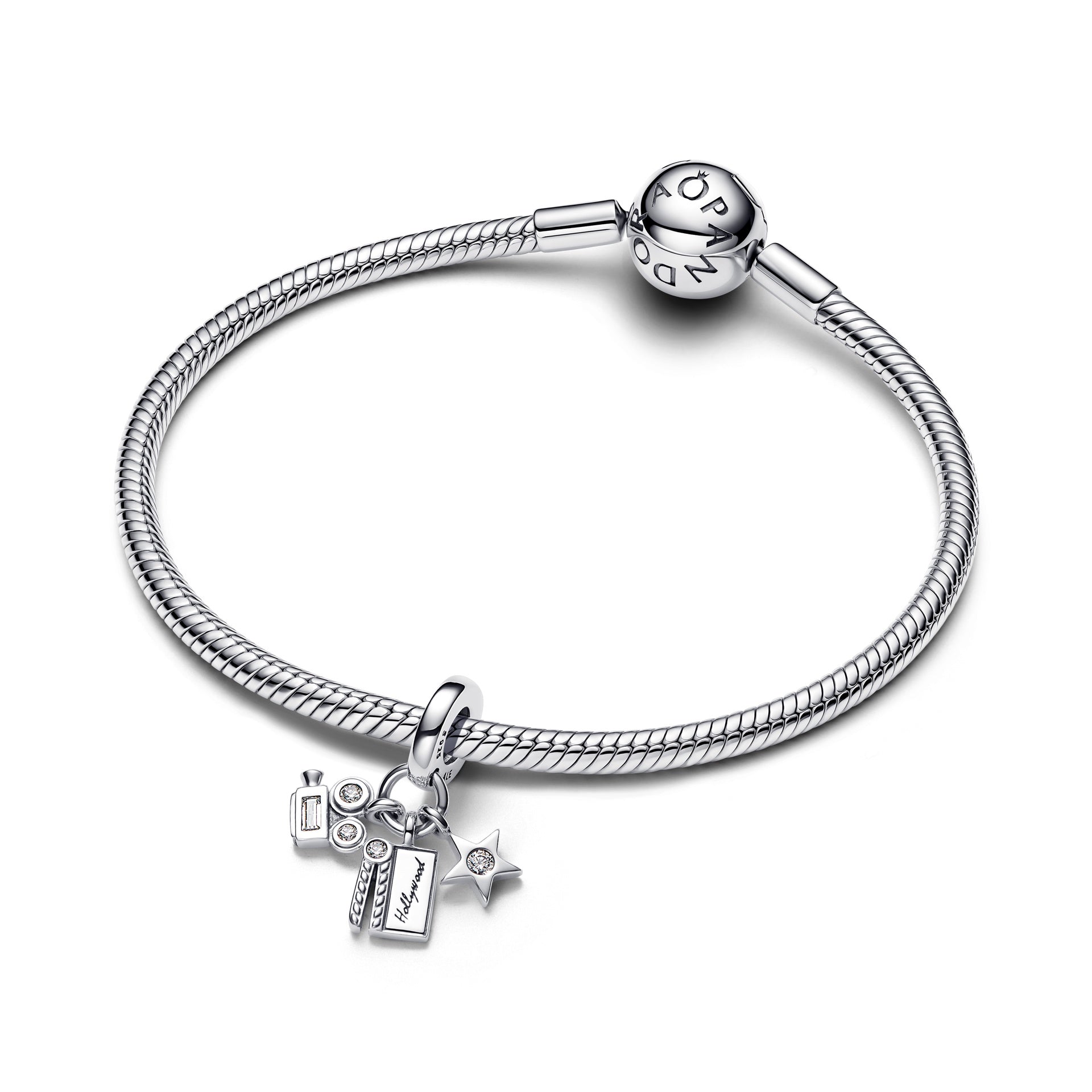 Lights, camera, action! Shine bright with our Hollywood-inspired dangle charm in sterling silver, featuring a clapperboard, film camera and a sparkling cubic zirconia star motif — engraved with ‘Hollywood’.