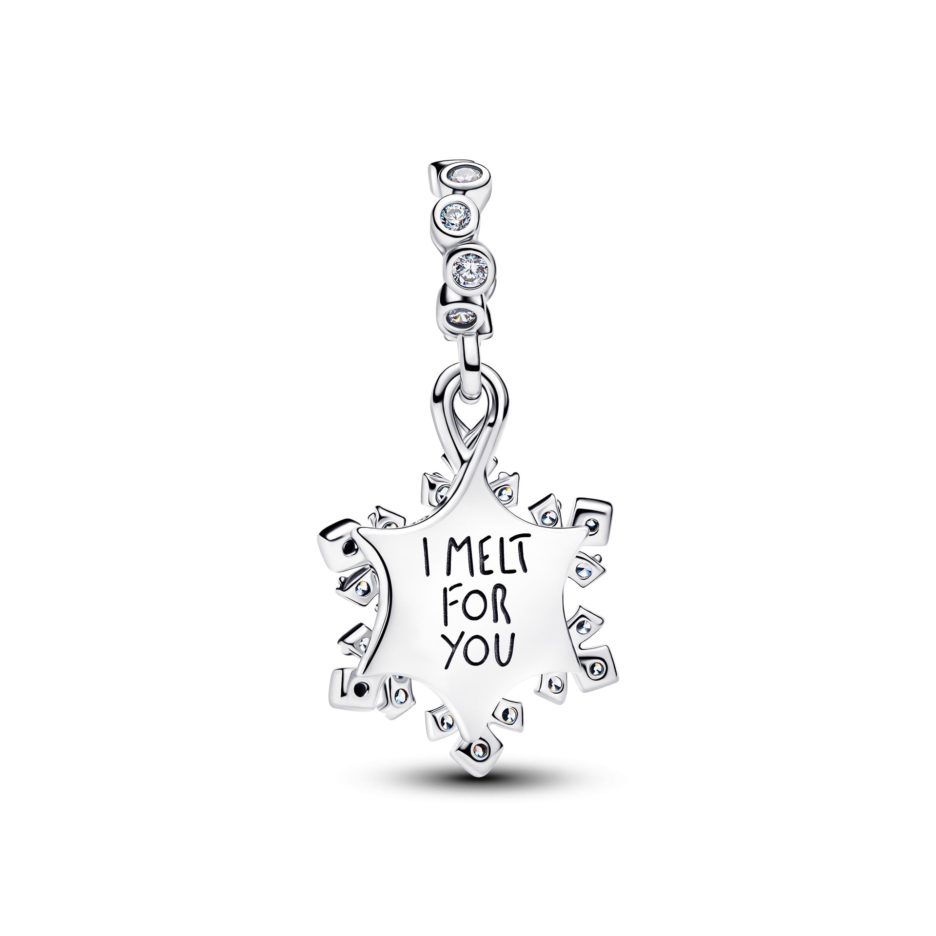Channel winter wonder in sterling silver. This charm pairs a sparkling snowflake with a shimmering star featuring aurora lab-grown opal resin on one side and the engraving ‘I MELT FOR YOU’ on the other.