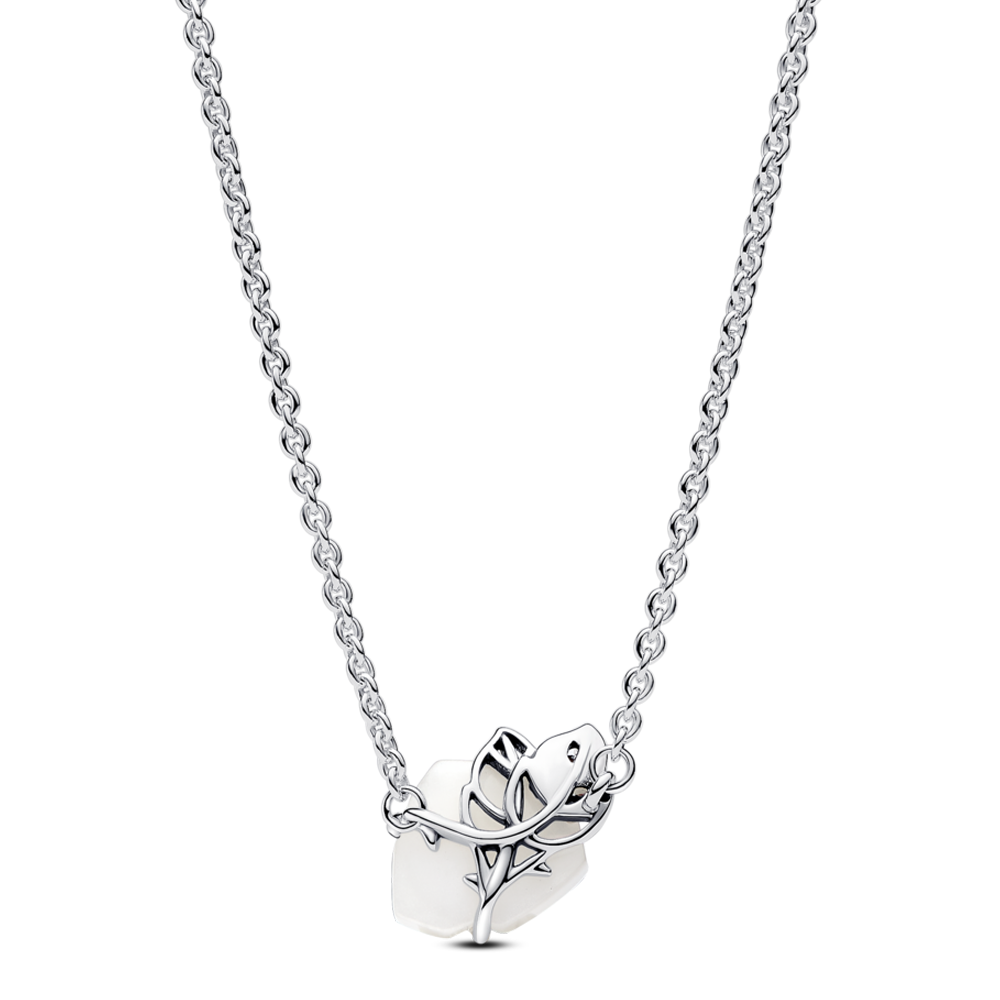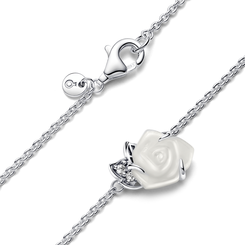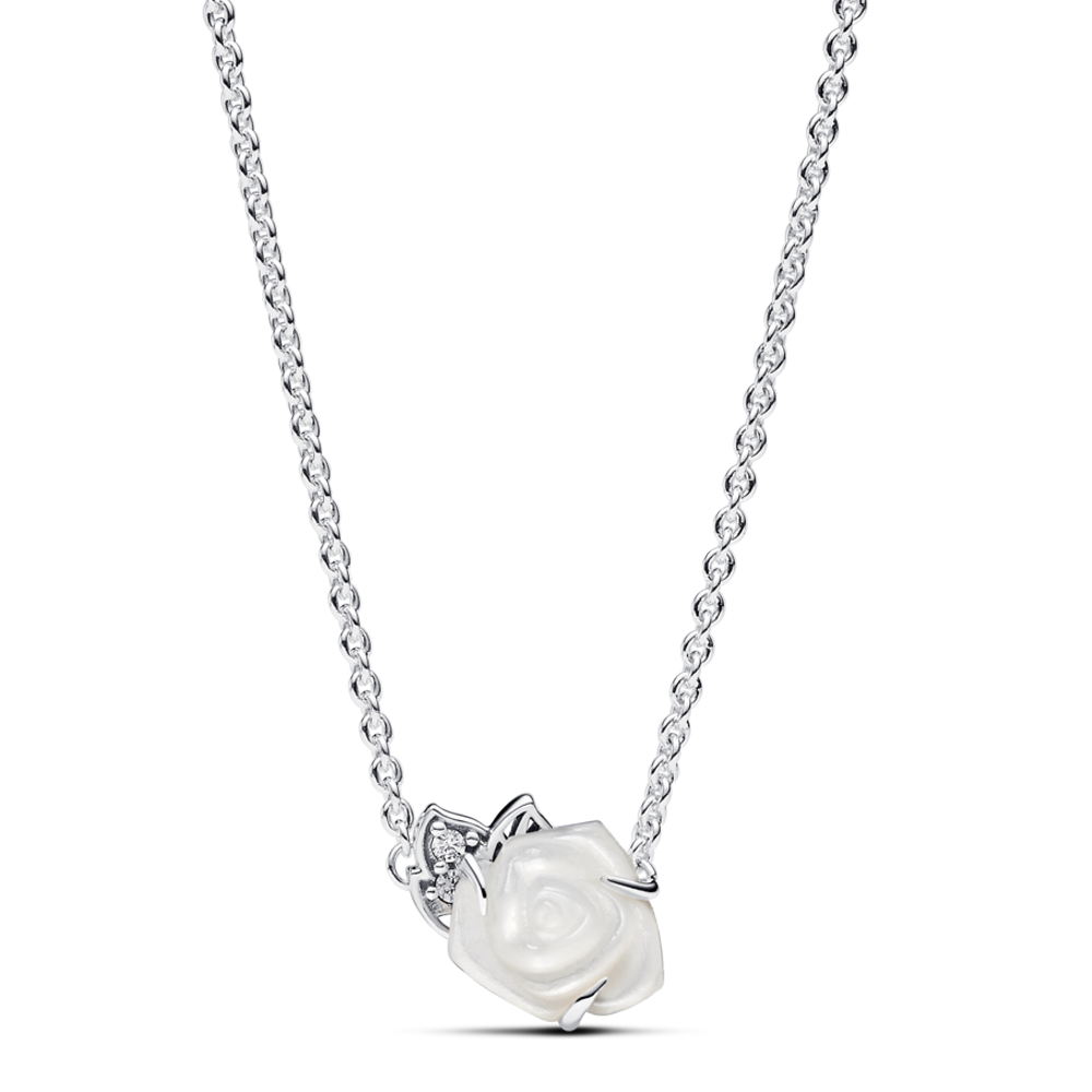 Embrace timeless elegance with our White Rose in Bloom Collier Necklace, a versatile sterling silver flower pendant necklace that goes with everything. A white bioresin man-made mother of pearl, delicately prong-set, unfolds into a blooming rose, symbolizing purity and love. The back side of the rose features two leaves, asymmetrically placed, which reveal subtle cut-outs and are embellished with brilliant cubic zirconia. Adjustable to 42 cm and 38 cm, this symbolic necklace echoes the cherished gesture of gifting a rose, a testament to the enduring power of love.