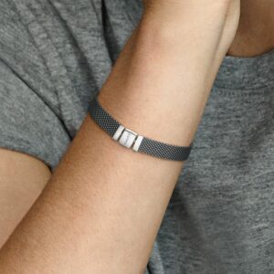 For those all black everything lovers or those that enjoy mixing up their metal finishes, the Pandora Reflexions™ mesh bracelet in oxidized sterling silver brings an exciting update to your look. The ‘living finish’ of this bracelet means that the black color will naturally transform and fade over time, revealing a lived-in patina look that gives it edge and character. Wear multiple Pandora Reflexions™ bracelets in a single or multiple metal finishes for the ultimate modern look.