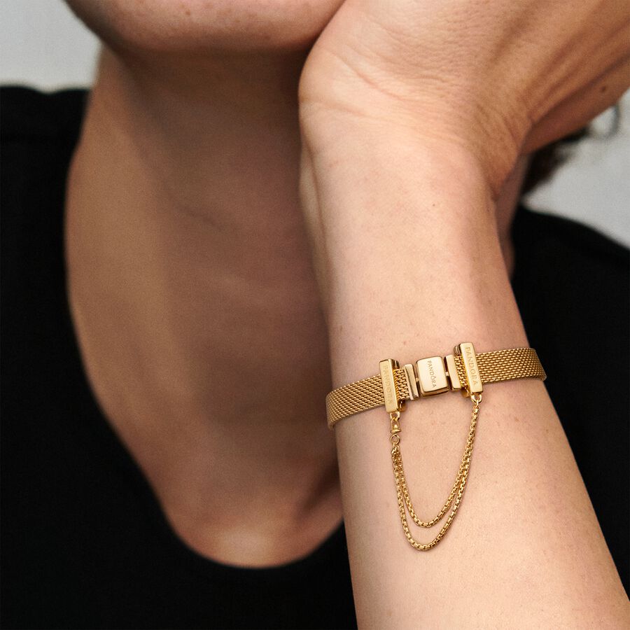 This 14k gold-plated Safety Chain Clip Charm is a glorious addition to your Pandora Reflexions collection. It has a concealed silicone grip that ensures it stays where you style it on your bracelet.
