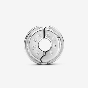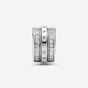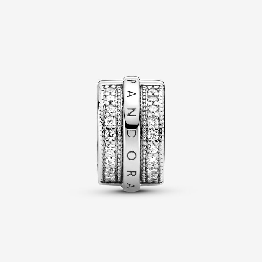 Make every day a little special with the Sparkling Pavé Lines & Logo Clip Charm. Hand-finished in sterling silver with two rows of bead-set clear cubic zirconia and a raised row with Pandora logo in the center, this clip charm can be worn to any event in any season and will make a sophisticated style statement. The sparkling pavé, embossed hearts and square edges bring intriguing detail to this instantly iconic piece. This clip charm features a silicone grip, does not fit onto threads (two raised charm dividers.) This charm can be styled anywhere else on the bracelet.