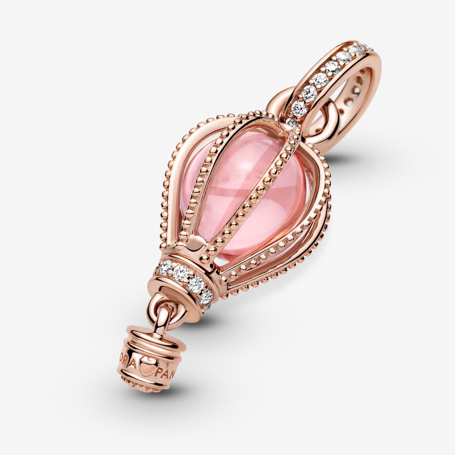 Reach new heights with the Sparkling Pink Hot Air Balloon Dangle Charm. This warm-toned charm is hand-finished in 14k rose gold plating. Beaded ropes encase a fairy tale pink crystal accented by shimmering clear cubic zirconia. The bail and base of the balloon are embellished with glittering pavé. Below, a small gondola awaits to transport you to your destination. Wear it for daily inspiration or gift it to someone who is ready for their next adventure.