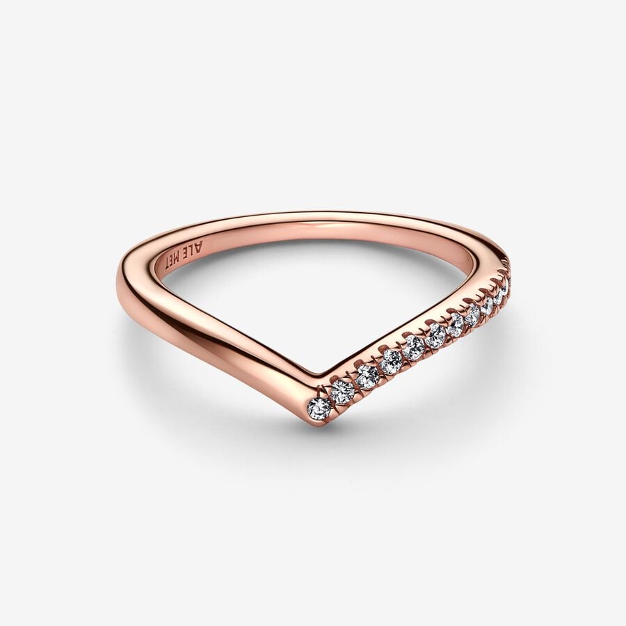 Make all your wishes come true with this delicate Sparkling Wishbone Ring, half-lined with 12 claw-set round brilliant-cut cubic zirconia stones on a 14k rose gold-plated band. Simple yet elegant, this wishbone-shaped ring can be worn on its own as a shimmering statement, or paired with other stackable rings to create a unique, highly individual look.StoneCubic ZirconiaColourClearThemesWishProduct TypeRingsItem182394C01Metal14k Rose gold-plated unique metal blendMaterialNo Other MaterialDimensionsDepth:2.3 mmHeight:4.6 mm