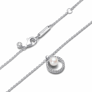 Level up your look with our Treated Freshwater Cultured Pearl & Pavé Collier Necklace. Crafted in sterling silver, it features an adjustable 45 cm chain, adorned with a lustrous treated freshwater cultured pearl and sparkling cubic zirconia. The pearl pendant gracefully slides along the chain, showcasing Pandora’s signature craftsmanship. Embrace timeless beauty and versatility. Perfect for special occasions or adding a touch of sophistication to everyday wear. Please note each treated freshwater cultured pearl is unique and can vary in size and colour; normal wear and tear may occur with this material. Our freshwater cultured pearls are treated with bleaching and lustre enhancement.