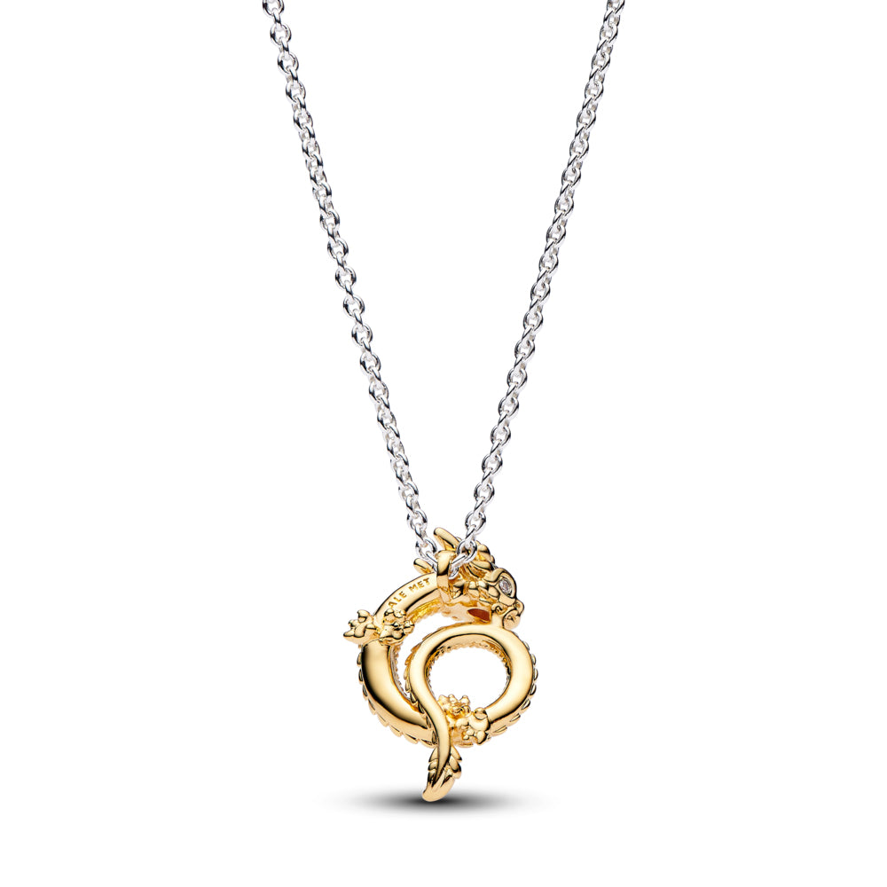 Invite good fortune in the coming year with the Two-tone Chinese Year of the Dragon Collier Necklace. 2024 is the Year of the Dragon – the 5th animal in the Chinese zodiac, this mythical creature represents good fortune, strength, power, wisdom and health. This sterling silver necklace features a curled dragon pendant in 14k gold plating with intricate details and a row of sparkling pavé along the dragon’s body. The pendant is not detachable and slides freely along the sterling silver chain, which is adjustable in length. A 14k gold-plated peace knot dangles near the clasp. Wear this necklace to invite the qualities of the dragon into your year ahead, or gift it to a loved one who was born in the Year of the Dragon.