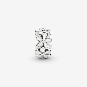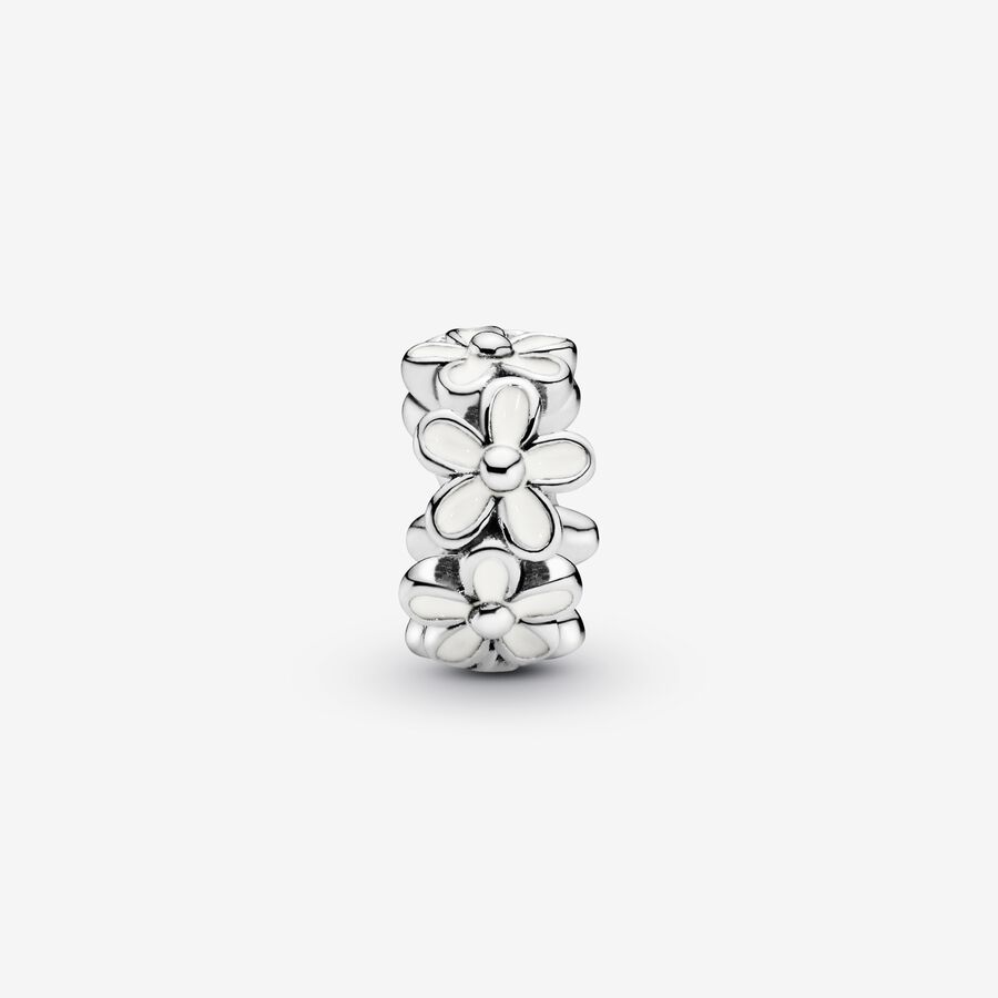 Daisies are a symbol of innocence and purity, freedom and fortitude. Encircled with white enamel daisies in a nod to the popular daisy chain, this pretty spacer charm in sterling silver lends natural appeal to your Pandora Moments bracelet. Add the simple design to your look to represent something you love.